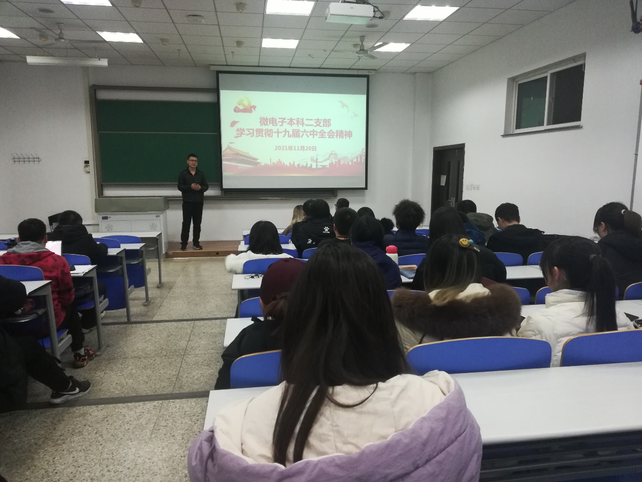 为了深入学习贯彻党的十九届六中全会精神,微电子本科二支部于11月20日晚在长安校区教东JD403开展了“学习贯彻党的十九届六中全会精神”主题党日活动。支部全体党员参加,活动由支部书记黄佛保老师主持。