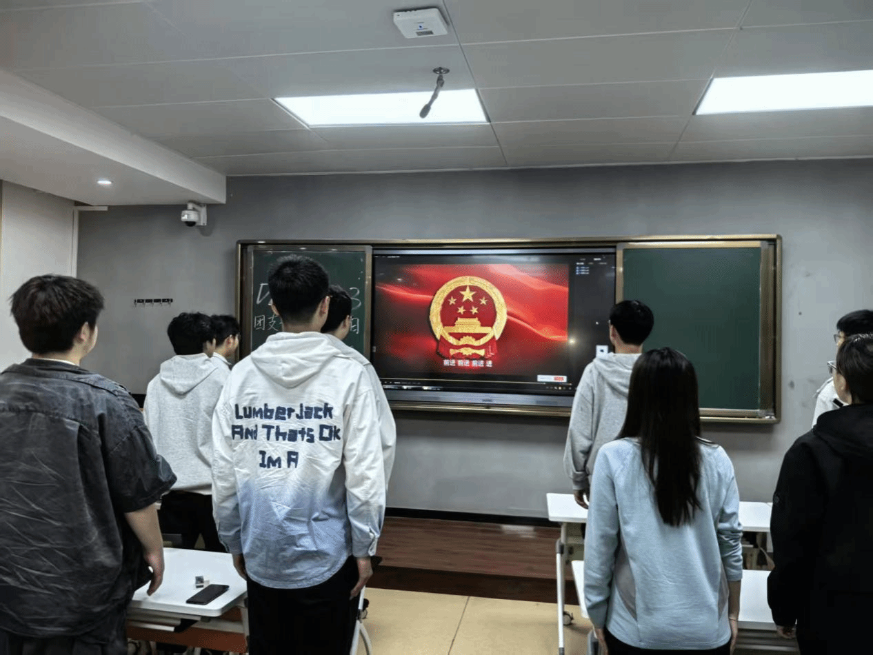 观影结束后,团支部成员移步至教学东楼进行总结会议。会议伊始,全体团员共唱中华人民共和国国歌,在庄严旋律中凝聚爱国情怀。
