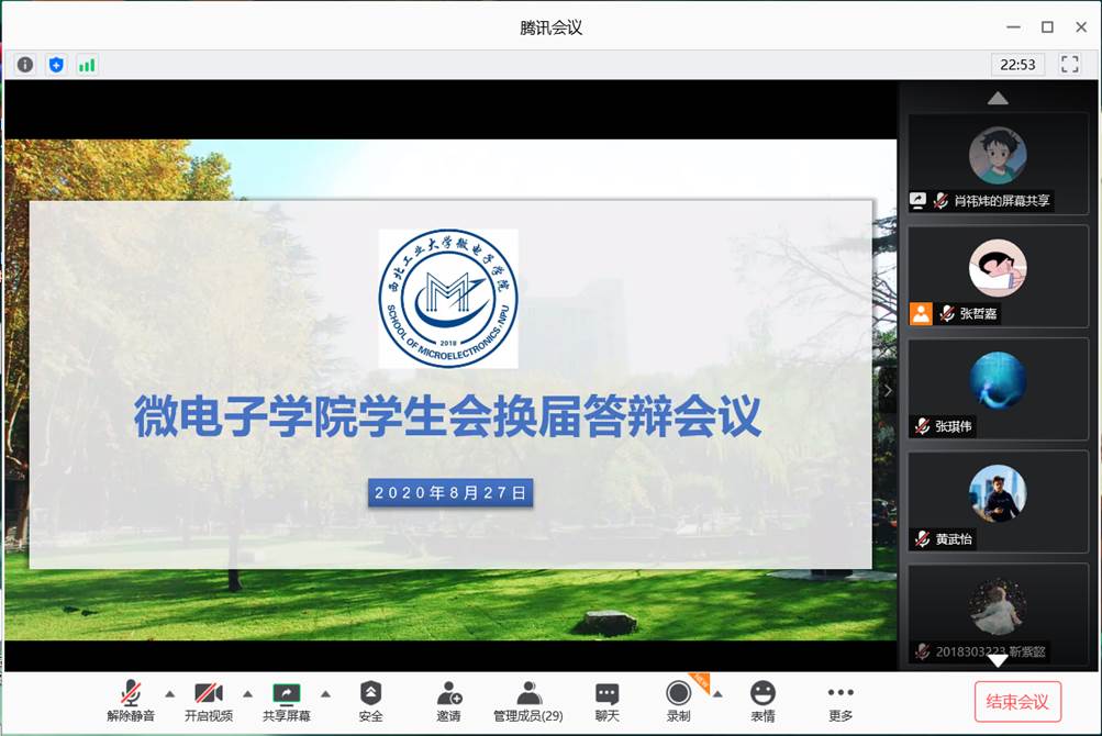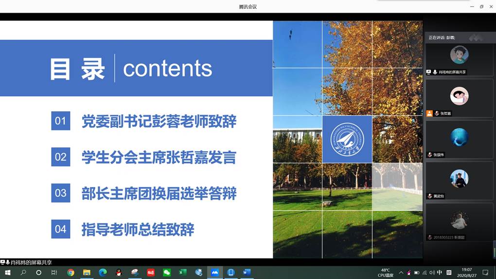 党委副书记彭蓉老师、团委书记汪钰成老师、2019级辅导员李伟老师出席了这次网络会议,参加会议的还有第一届MissAV 学生会主席、部长团以及16位参加换届选举答辩的同学们。