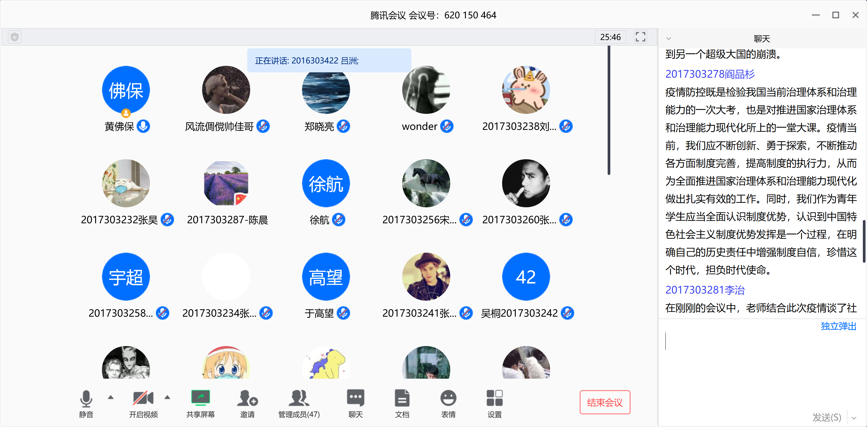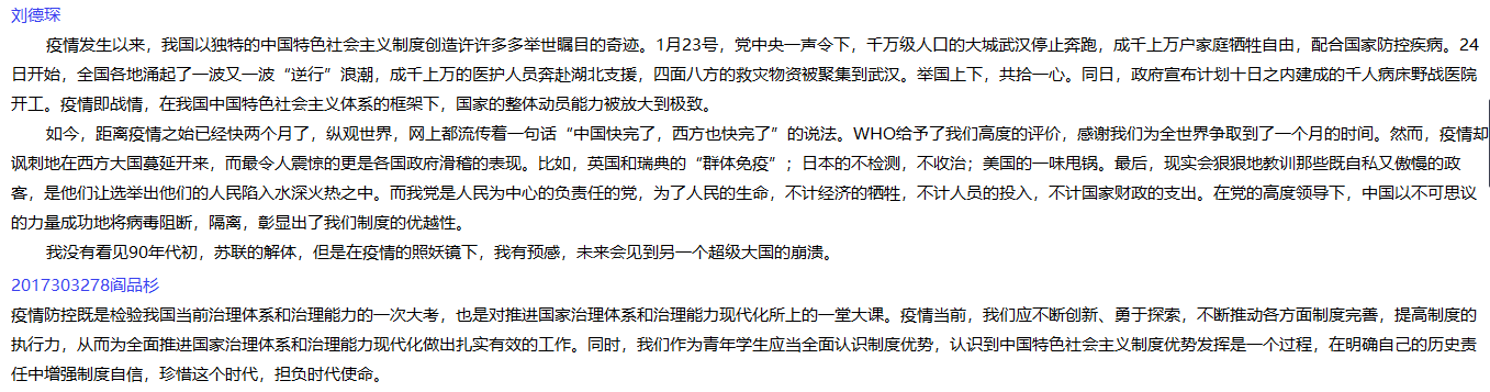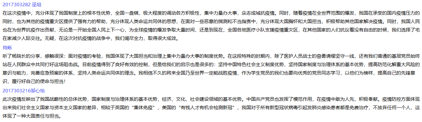 支部副书记李天昊、组织委员吕洲和宣传委员郑晓亮三位同学带头交流了个人学习感悟,新转正的学生党员王爰俭、杨虎和乔晨静等同学也依次发表了自己的感想。大家积极踊跃地从不同方面阐述了对疫情防控的切身感受,表示作为党员将会以身作则,用实际行动助力抗“疫”工作。