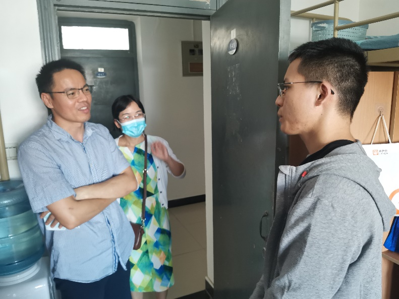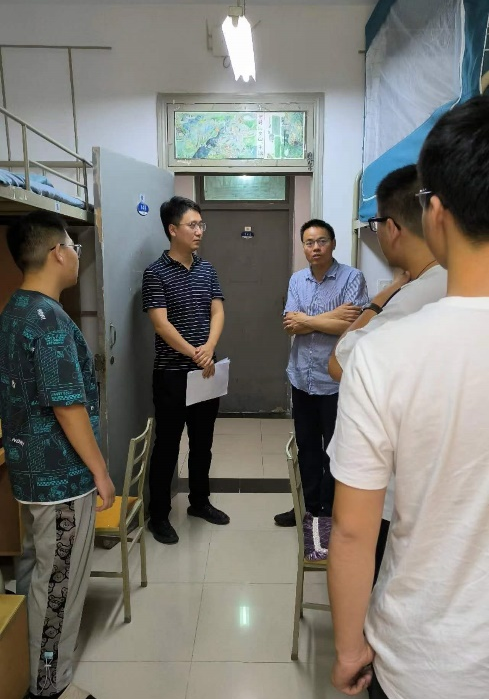 老师深入每个新生宿舍,交流入学和入校感受,询问实际困难和需求,征求意见建议,同时对新生们提出了殷切希望和具体要求。甘雪涛书记向同学们分享了自己的大学时光和切身感悟,指出同学们要及时树立远大理想和大学目标,瞄准定位、打好基础、努力深造,时刻保持学习、生活良好规律,共同营造积极向上的班风、舍风,一起提高进步。