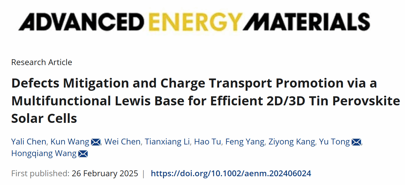 引用本文:Yali Chen, Kun Wang*, Wei Chen, Tianxiang Li, Hao Tu, Feng Yang, Ziyong Kang, Yu Tong*, Hongqiang Wang*,Defects Mitigation and Charge Transport Promotion via a Multifunctional Lewis Base for Efficient 2D/3D Tin Perovskite Solar Cells.