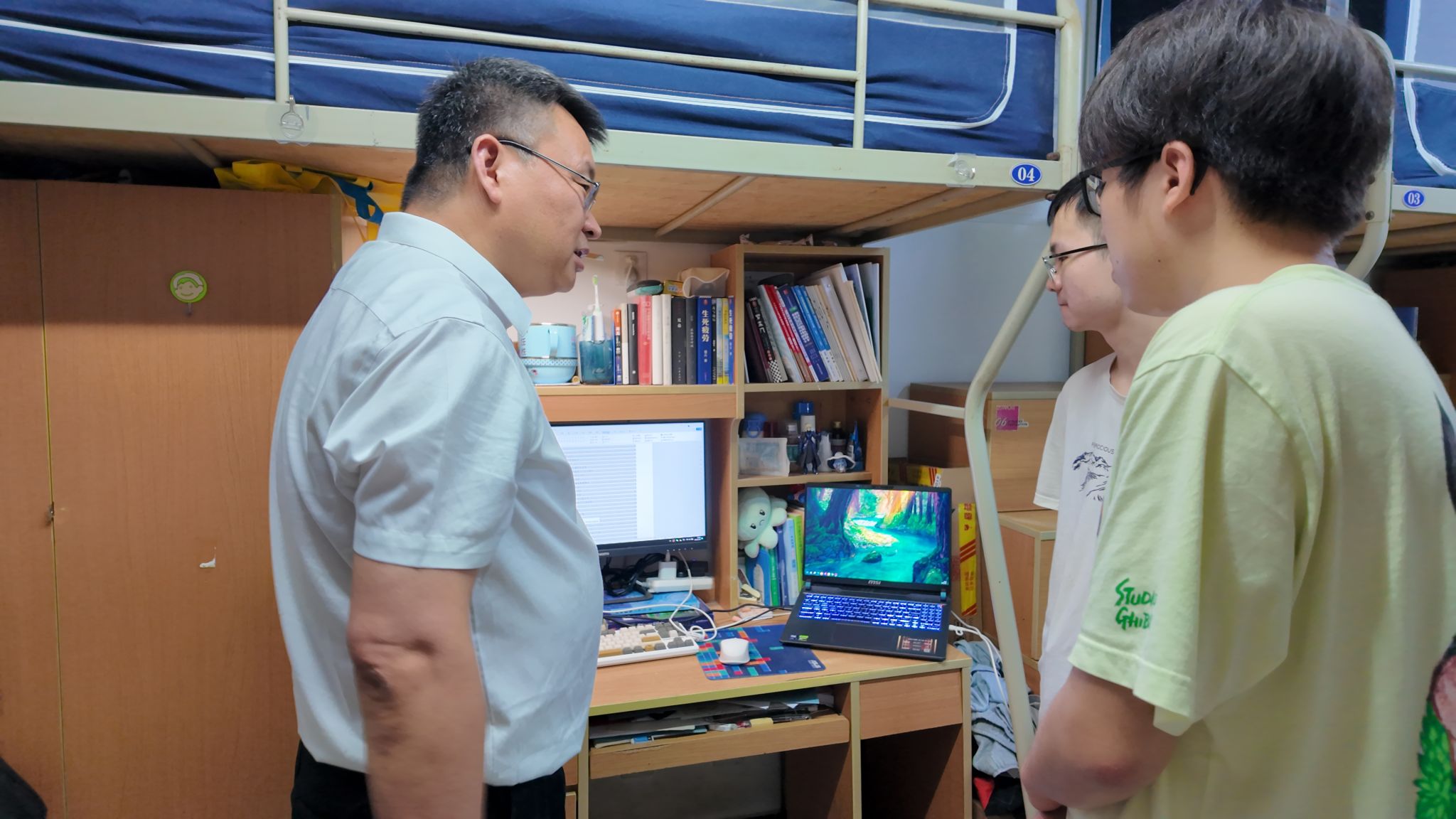 马炳和院长走访2021级本科生宿舍,围绕离校安排、职业规划、升学深造等议题与学生深入交流,以丰富经验和专业视角为学生答疑解惑。同时,针对毕业设计的框架优化、数据解析等环节给予专业指导,助力学生以高质量成果收官大学生涯。