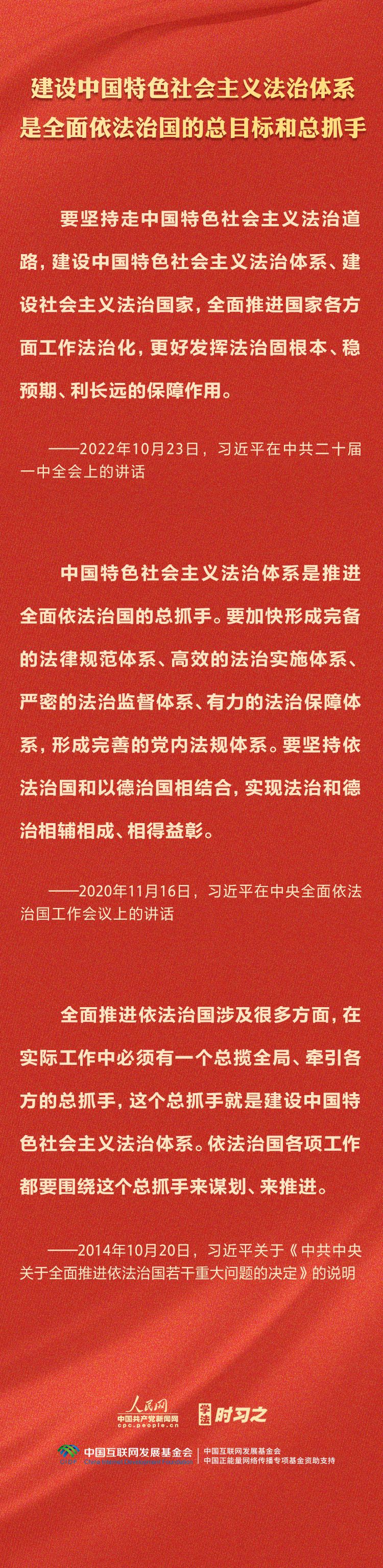 今年是贯彻落实党的二十大精神的开局之年。中共中央政治局决定从今年4月开始,在全党自上而下开展学习贯彻习近平新时代中国特色社会主义思想主题教育。习近平法治思想是习近平新时代中国特色社会主义思想的重要组成部分,人民网·中国共产党新闻网推出学法时习之·学习习近平法治思想系列策划,本篇聚焦“坚持建设中国特色社会主义法治体系”。